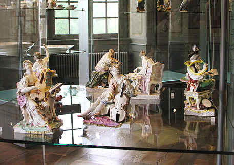 Höfisches Vergnügen: Musikkapelle, bestehend aus Lautenspielerin, Cellospieler und Hornbläser, sowie (im Hintergrund) Violinist, Klavierspielerin und Notenschreiberin,