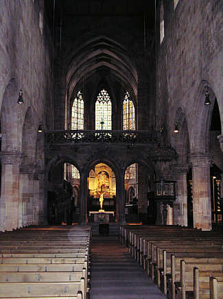 3schiffige gotische Basilika mit hochgelegenen Obergadenfenstern.