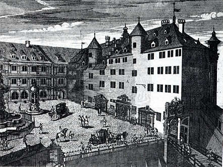 "Cantzlei Bau Nebst Beifügung des Newen Gesandten Hauses" Kupferstich, nach 1715 Im Vordergrund der alte Schlossgraben |