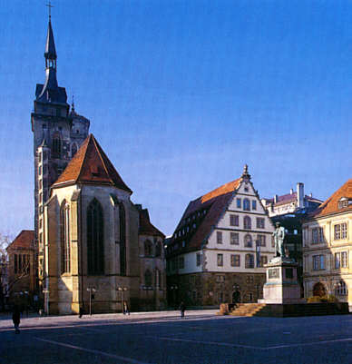 Auf romanischen Fundamenten 1321 - 1495 errichtete Stiftskirche, nach der Übertragung des Chorherrenstifts Beutelsbach 1321 Hauptkirche der Stadt.