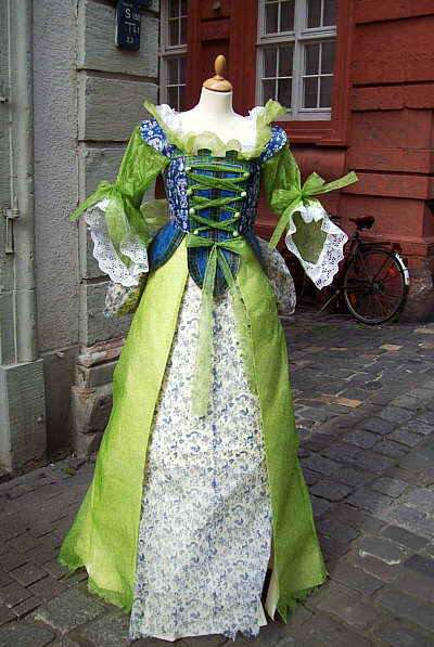 Grünes Mantelkleid mit geschnürtem blauem Mieder und Spitzenbesatz an den Ärmeln
