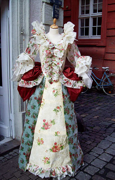 Mantelkleid im großblumigen Dekor mit roter Drapierung in der Hüfte und Volant im Oberteil