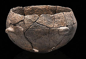 Restauriertes Großgefäß mit Knubben aus einer Abfallgrube im Zentrum der Siedlungsfläche, Foto: Y. Mühleis/LAD