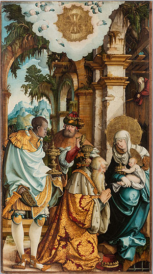 Meister von Meßkirch, Die Anbetung der Heiligen Drei Könige, Mitteltafel des ehemaligen Hochaltarretabels von St. Martin in Meßkirch, um 1535/40, Nadelholz, 165,7 x 92,8 cm, Meßkirch, Pfarrkirche, © Erzbischöfliches Ordinariat Freiburg i. Br., Bildarchiv, Aufnahme Michael Eckmann