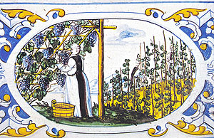 Zwei Kacheln vom Fayence-Ofen im Sommer-Refektorium der Mönche mit Darstellungen von Bäckerei und Arbeiten im Weinberg. Foto: SSG