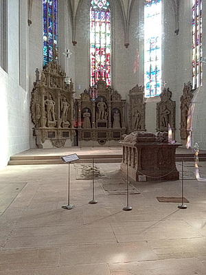 Was die Grablegen betrifft, sind die Epitaphien der Württemberger Herzöge in Tübingen ebenso noch erhalten wie die der badischen Markgrafen, die hier 1535 ihre Residenz aufschlugen und die Pforzheimer Stiftskirche zur Schlosskirche machten. Die Heidelberger Grablege wurde 1693 nahezu vollständig zerstört - 45 Epitaphien zum Teil außerordentlichen Ausmaßes von MItgliedern der kurfürstlichen Familie waren hier aufgestellt. Man muss heute schon nach Meisenheim am Glan oder nach Simmern in den Hunsrück, um eine Ahnung davon zu bekommen, wie sich das Selbstbewusstsein der Pfalzgrafen manifestierte. Dort aber sind es Seitenkapellen, die die Epitaphien aufnahmen, nicht der Chor der Kirche.