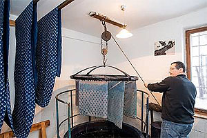 Links: Der bedruckte Stoff wird auf einen besonderen Rahmen aufgespannt (Stern-Reif /ráfy /ráf /ráfy) und in das Indigobad eingetaucht (Bottich, genannt Küppe/ kypa/ Küpe/ küpa/ kypa). Wenn der Stoff herausgezogen wird, färbt er sich unter der Einwirkung des Luftsauerstoffs von gelb zu grün und zu blau. Foto© Archive of The National Institute of Folk Culture (Czechia), 2017