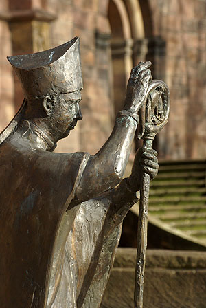 Worms, moderne Bronzeplastik des Bischofs Burchard