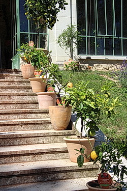 Links: Arrangement von Zitruspflanzen auf derTreppe zur Orangerie