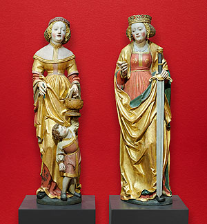 Heilige Dorothea, heilige Katharina. Oberschwaben, um 1515/20. originale Farbfassung, teilweise restauriert und ergänzt. Aus Horgenzell-Ringgenweiler