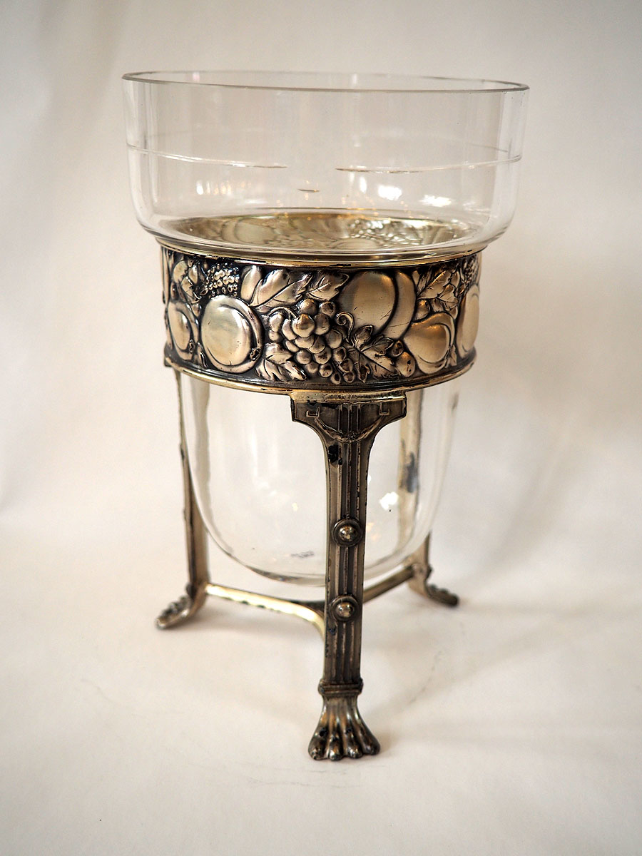 Unser Gefäß stammt aus der Zeit um 1900. Der Hersteller ist unbekannt. Das Glasgefäß ist mundgeblasen, beim Metallgestell des Traubenwäschers handelt es sich um einen vernickelten Zinnguss.