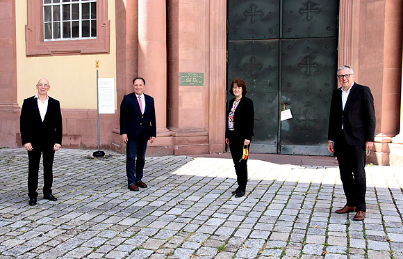 Pressebild in Zeiten des Abstandsgebots: Michael Hoerrmann, Geschäftsführerf der SSG, Bernd Müller, Amtsleiter Vermögen und Bau BW Mannheim, Staatsekretärin Gisela Splett und Mannheims OB Dr. Peter Kurz.