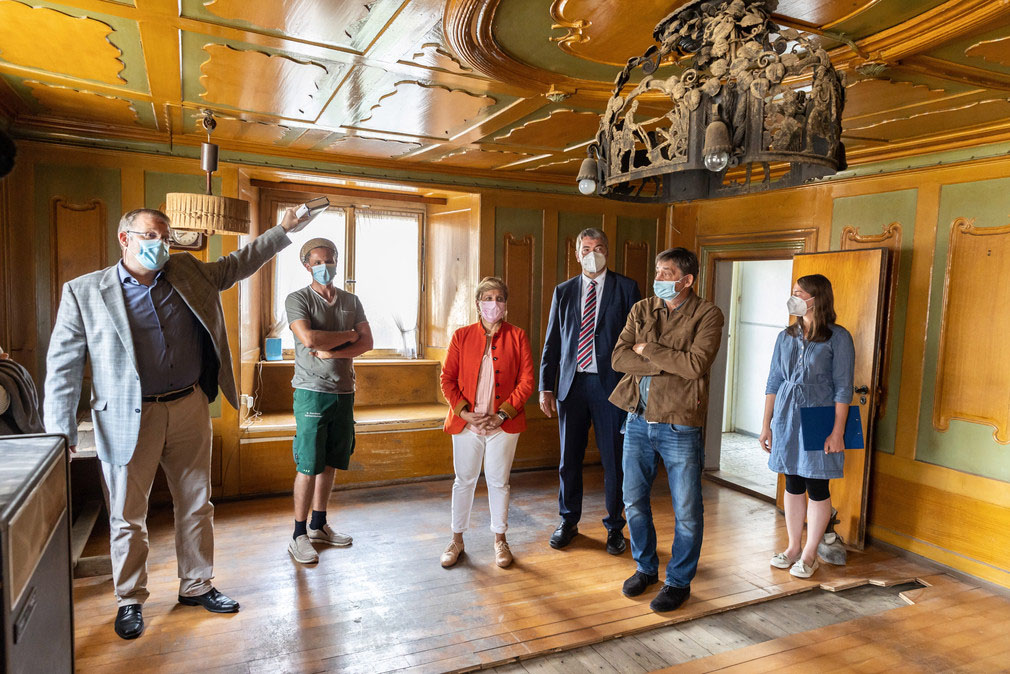 Links: Ministerin Nicole Razavi MdL beim Besuch eines ehemaligen Vogtsbauernhofs in Villingen-Schwenningen. Von links: Dr. Folkhardt Cremer (Landesamt für Denkmalpflege), Ralf Kornhaas (Eigentümer), Nicole Razavi MdL (Ministerin für Landesentwicklung und Wohnen), Detlev Bührer (Bürgermeister Villingen-Schwenningen), Prof. Dr. Claus Wolf (Präsident, Landesamt für Denkmalpflege), Tabea Brandt (Gebietsreferentin, Landesamt für Denkmalpflege).