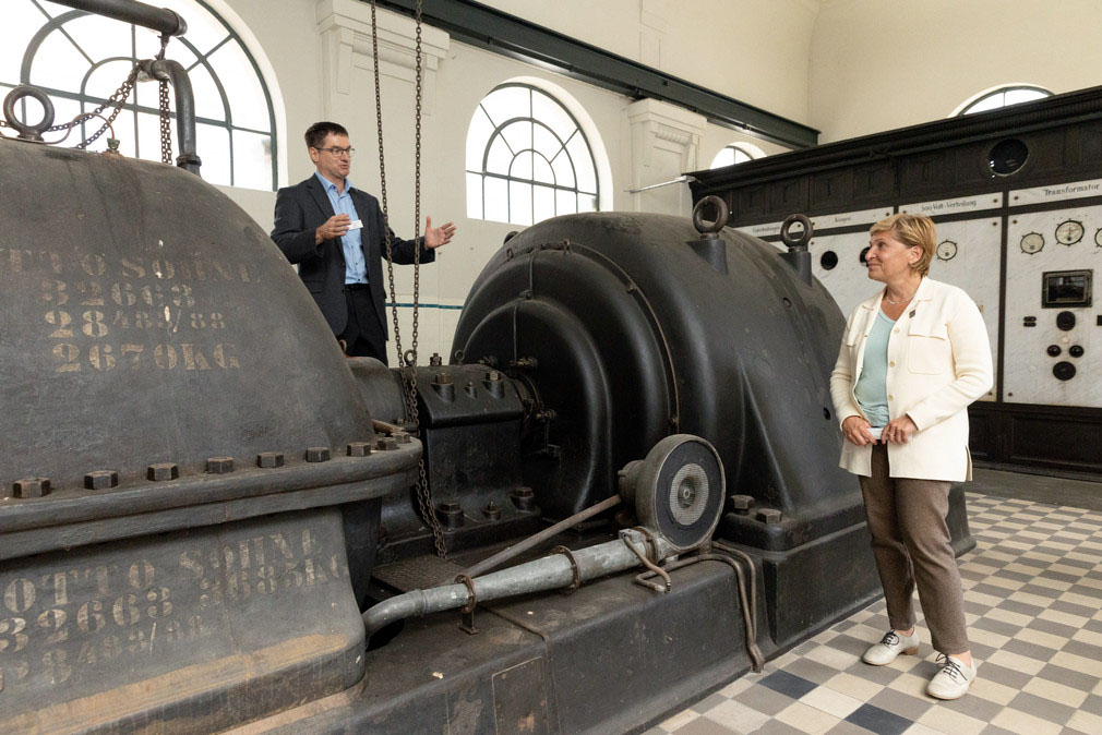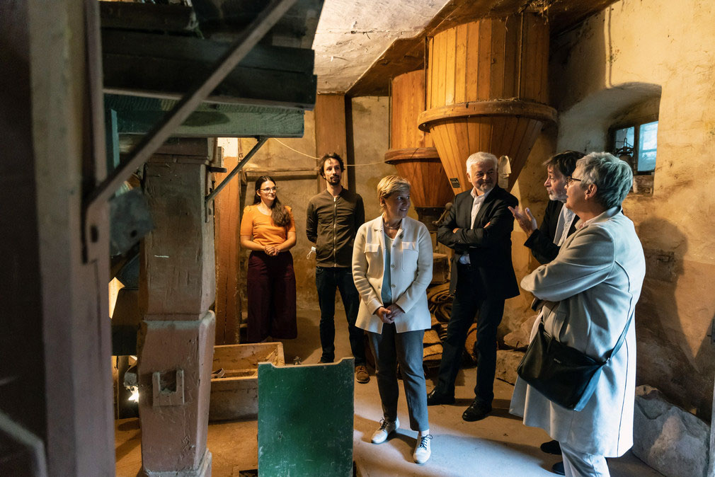 Links: Ministerin Nicole Razavi MdL (Mitte) besichtigt die Mühlentechnik in der Oberen Mühle am Amorsbach bei Külsheim.
