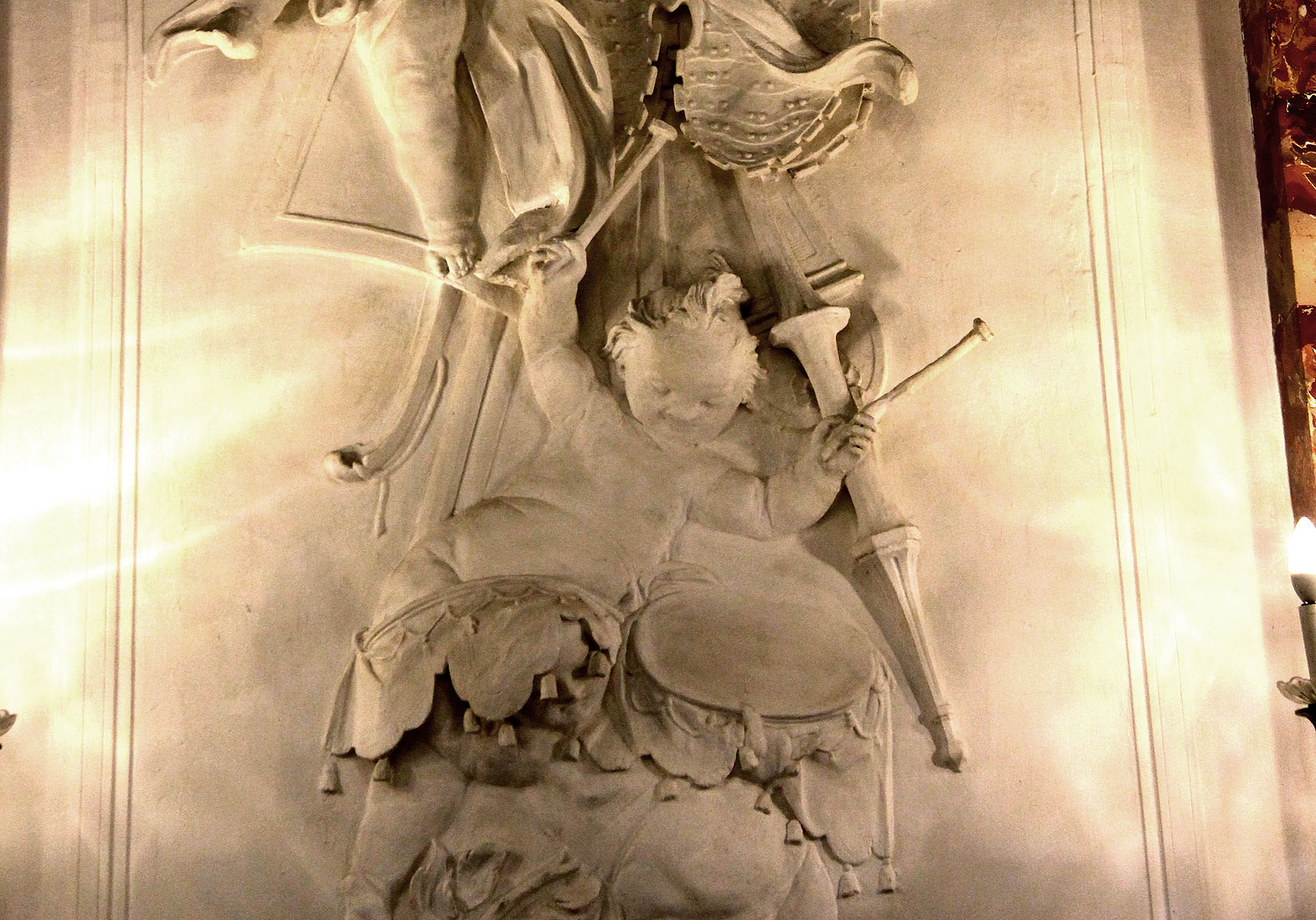 Schloss Mannheim, Paukeschlagender Putto. Pilasterrelief im Rittersaal