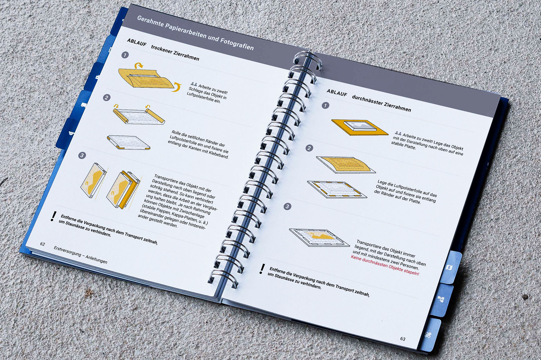 „Die Ideen, die die beteiligten Studierenden entwickelt haben, haben uns total begeistert, sodass wir beschlossen haben, das Projekt tatsächlich zu verwirklichen“, erklärt die Historikerin. „Eine Förderung als Modellprojekt aus Bund-Länder-Mitteln der Koordinierungsstelle für die Erhaltung des schriftlichen Kulturguts (KEK) hat uns ermöglicht, die Studierenden offiziell mit der Umsetzung ihrer Konzepte zu beauftragen.“ Mit Hanna Breimann, Kim Janke, Tobias Moser und Annemarie Woeste haben sich vier junge Nachwuchsdesigner*innen gefunden, die sich neben ihrem Studium nun der Aufgabe widmen, das in Brauns Seminar entwickelte Notfall-Konzept zu verwirklichen. Unter anderem sollen Rollups mit kurzen Anweisungen zur Übersicht, ein umfangreicher Anleitungskatalog mit schnell verständlichen Illustrationen und kurzen Sätzen und außerdem ein visuelles Leitsystem entstehen. „Wir möchten den Einsatzkräften die Orientierung und Organisation vor Ort ermöglichen“, erklärt Woeste. „Durch Rollups, farbliche Teamkennzeichnungen und andere visuelle Hinweise, die den Beteiligten schnell verständlich machen, was wohin muss und wie genau sie vorgehen sollen“, ergänzt ihr Kommilitone Moser.