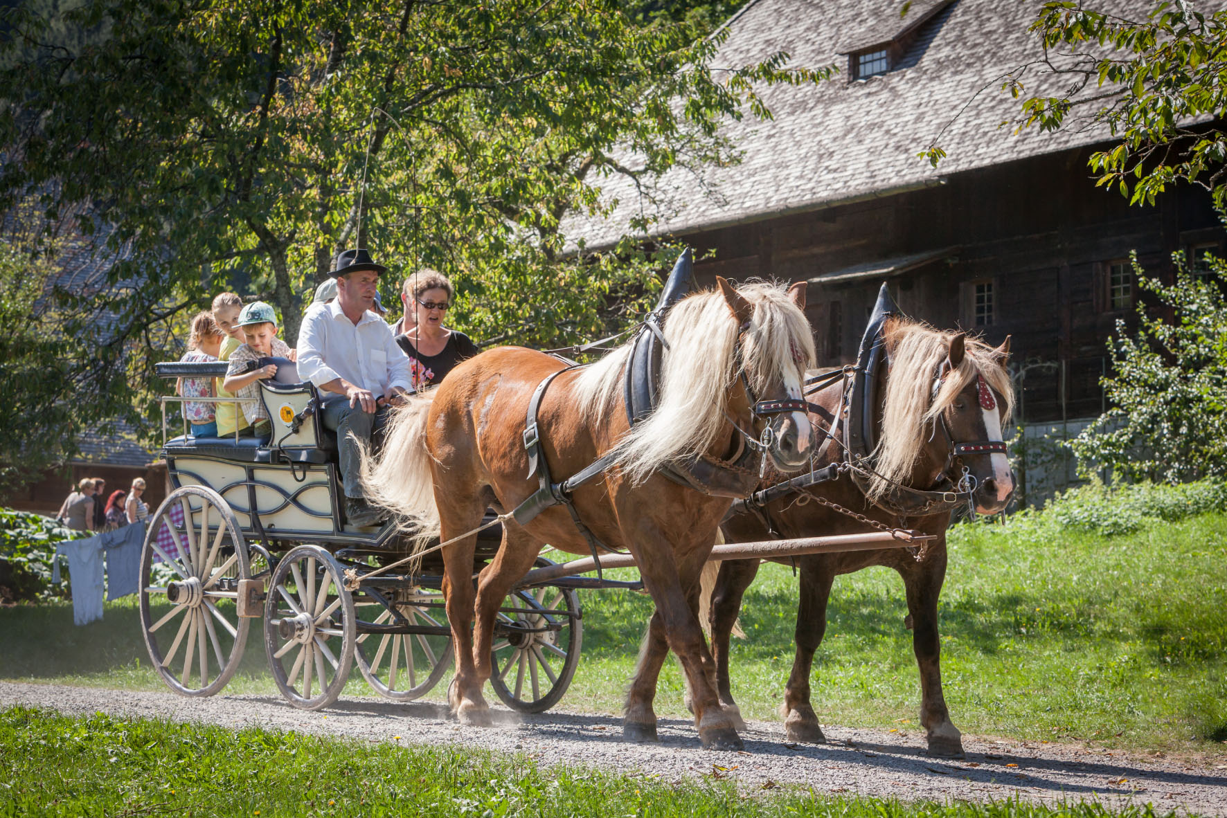 Wer das Freilichtmuseum selbst auf einer Kutsche erkunden möchte, hat dazu ebenfalls die Gelegenheit. Von 11 bis 17 Uhr steht eine Pferdekutsche mit Schwarzwälder Füchsen für eine Rundfahrt über das Gelände bereit.