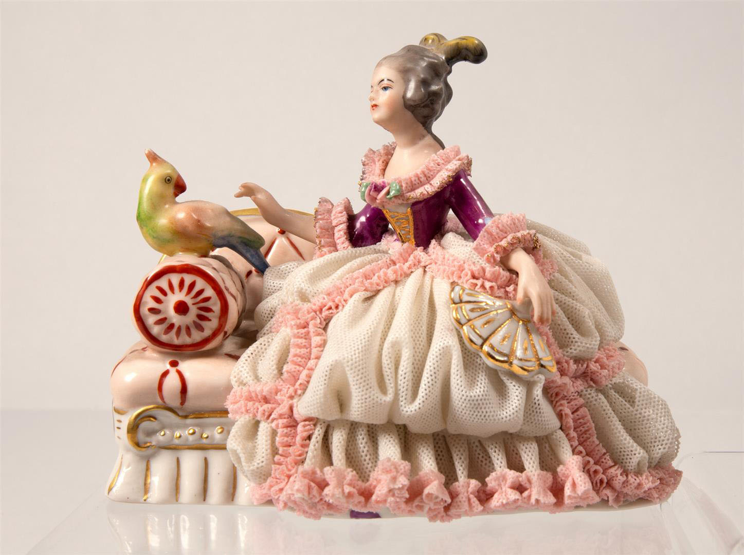 Im Formenspektrum der Figuren des Wesselsporzellan spielten Sujets in Anlehnung an Barock und Rokkoko eine wichtige Rolle. Eine weitere Besonderheit, die sich auch als Zierelement in der höfischen Kleidung der Frankenthaler Papageienfreundin wiederfindet, ist die Technik der filigranen Porzellanspitze. Hierbei wird das eigentliche Spitzenmaterial mit einer hauchdünnen Parzellanflüssigkeit überzogen, sodass sie beim anschließenden Brennvorgang vergeht und nur die Struktur des gebrannten Überzugs bestehen bleibt.