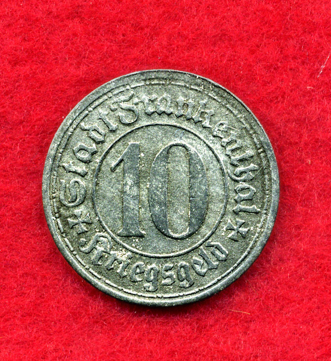 Wie die Motive weiterer lokaler Notgeldmünzen geht auch die Gestaltung des gezeigten 10-Pfennig-Stücks auf den Frankenthaler Künstler und Bildhauer Walther Perron zurück, der im Auftrag der Stadt verschiedene Entwürfe für das Frankenthaler Notgeld erstellte. Im Mittelpunkt steht der dem Stadtwappen entlehnte, stilisierte Eckstein, eingerahmt durch den Wahlspruch der Stadt, „Gott ist unser Eckstein“. Eine weitere Besonderheit liegt im historischen Hintergrund. Perron orientierte sich bei seinem Entwurf an den Frankenthaler „Notklippen“, die aus der Zeit des Dreißgjährigen Krieges stammen. Während der Belagerung durch spanische Truppen, war die Stadt auch hier gezwungen, eine eigene behelfmäßige Währung zu prägen.