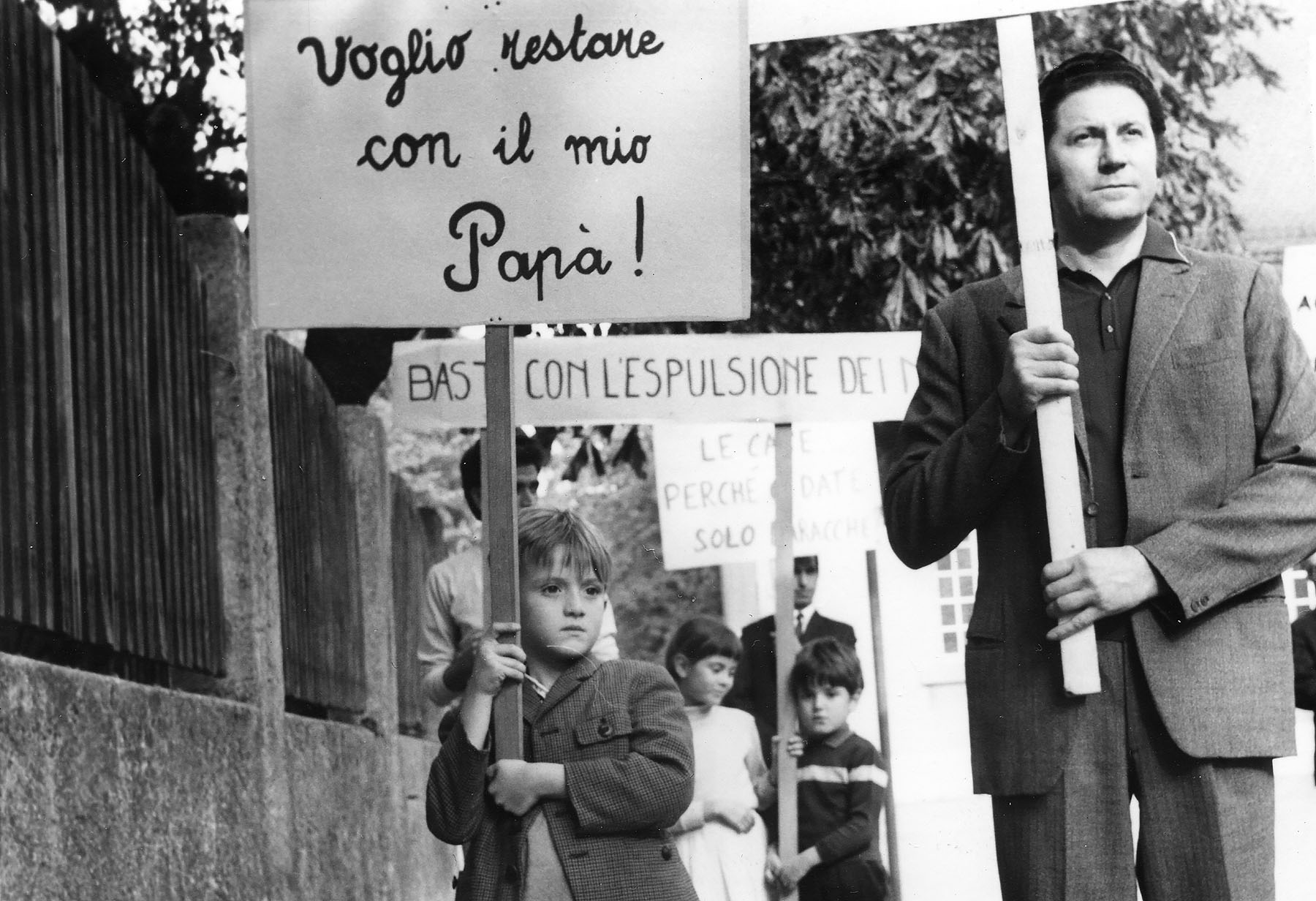 Kinder von Saisonniers erhalten keine Aufenthaltsbewilligung. Wenn sie in die Schweiz mitkommen, müssen sie sich verstecken. Demonstration für die Abschaffung des Saisonnierstatus. Filmstill, «Lo stagionale», Alvaro Bizzarri, 1972. © Schweizerisches Sozialarchiv