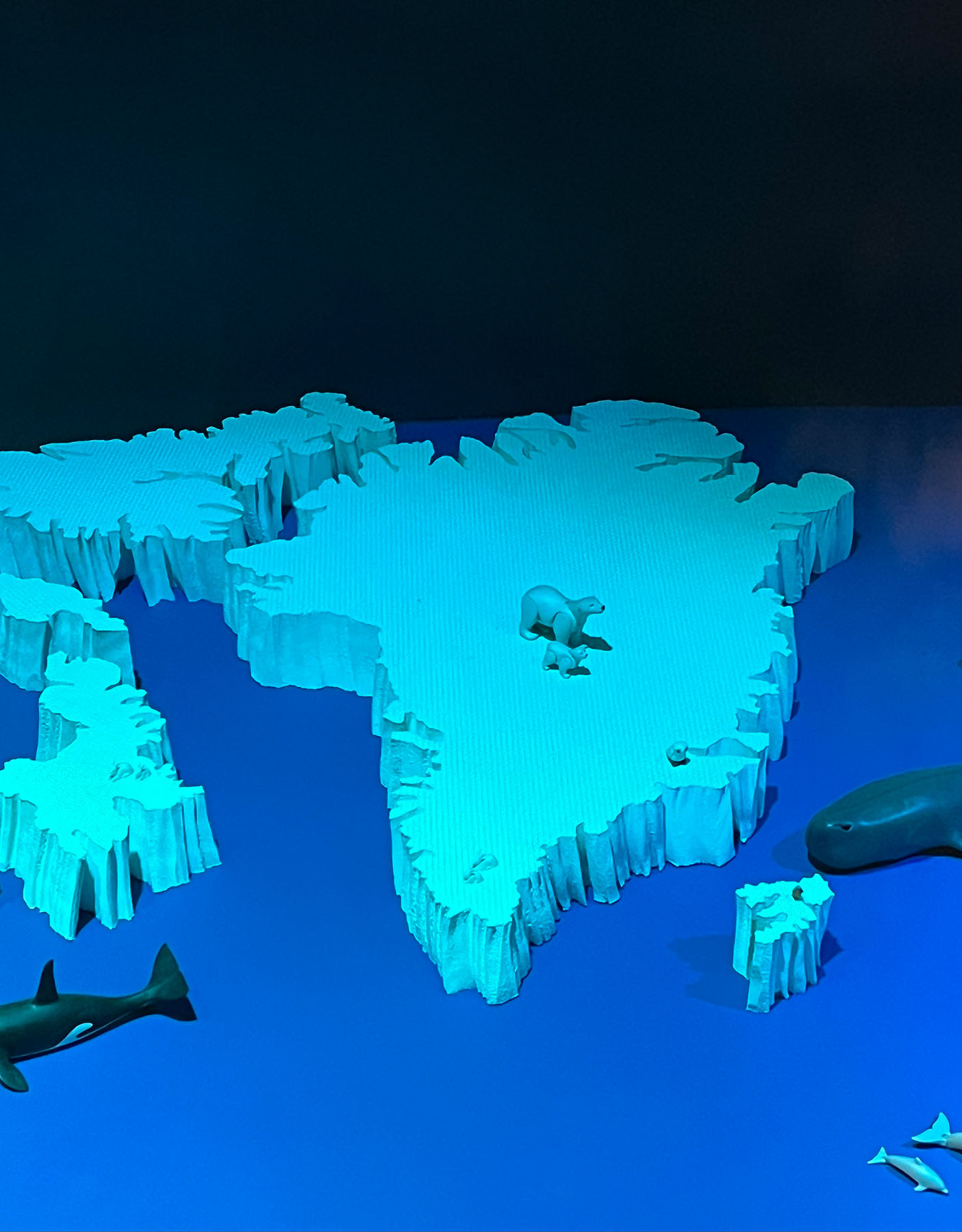 Aus dem Fenster eines inszenierten Raumschiffs blickt das Museumspublikum auf eine modellhafte Weltkarte hinab. Auf den Kontinenten tummeln sich allerlei PLAYMOBIL-Tiere. So gibt es neben Vögeln, Walen und Eichhörnchen, hoch im Norden auch eine Eisbärenmutter mit ihrem Jungen. Das Museum lädt an einer interaktiven Station zum konstruktiven Austausch ein: Was kann jeder einzelne Mensch tun, um der Umweltbedrohung entgegenzuwirken? Stifte, Papier und Pinnwand stehen zur Verfügung. Dort hinterlassen die Besucherinnen und Besucher Gedanken wie: „Wenn wir nicht die Erde retten, wer dann?“. Manche machen Vorschläge, ähnlich wie diesen: „Wir können unseren Müll recyceln und ihn nicht in die Umwelt schmeißen“. Andere drücken ihre Wünsche und Hoffnungen aus: „Ich wünsche mir, dass jeder einen Ort hat, wo man sicher ist.“