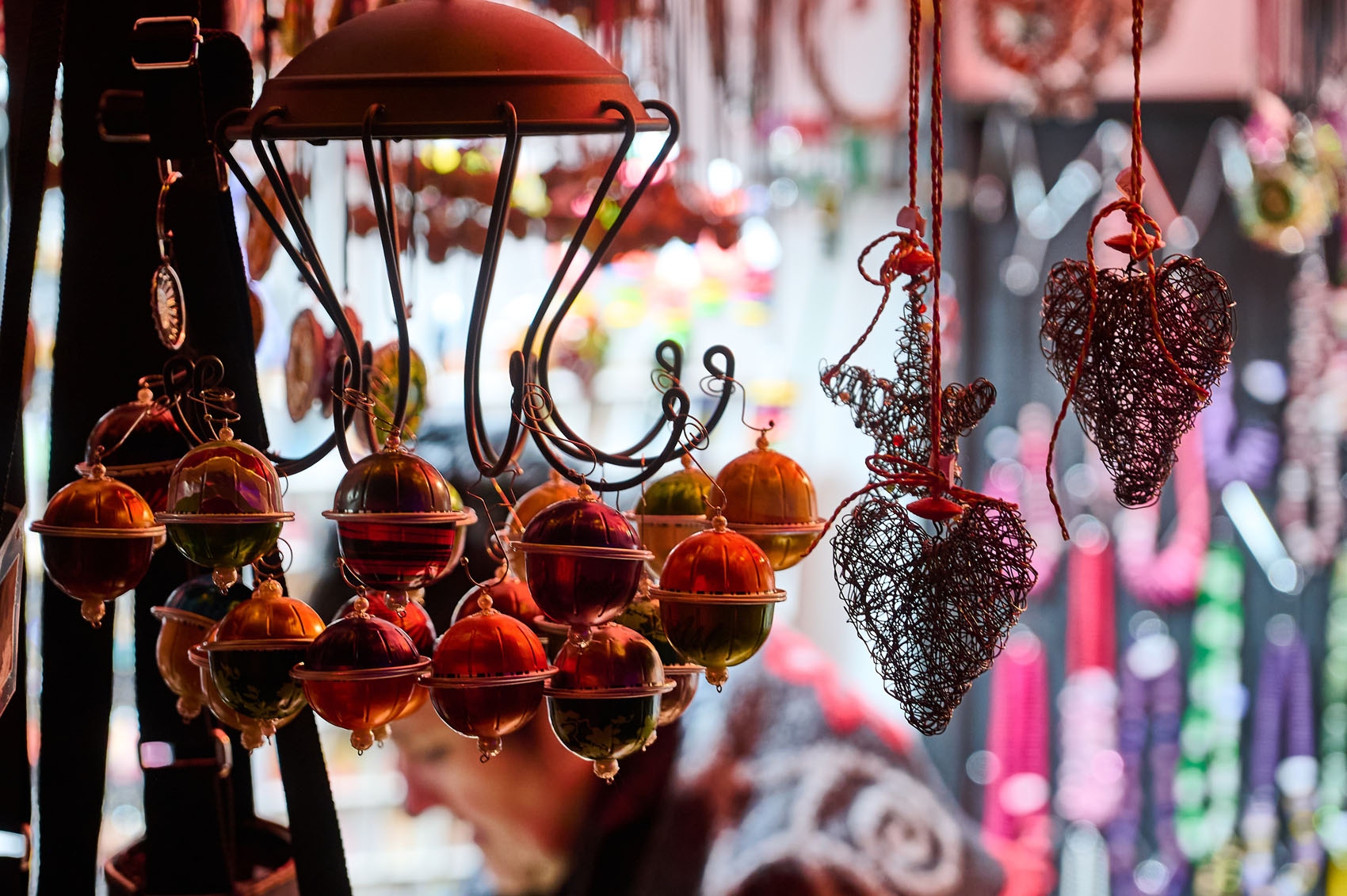 Weihnachtlicher Schmuck auf dem Adventsmarkt. Weihnachtlich geschmücktes Tannenbäumchen im Deutschen MusikautomatenmuseumWeihnachtlicher Schmuck auf dem Adventsmarkt.