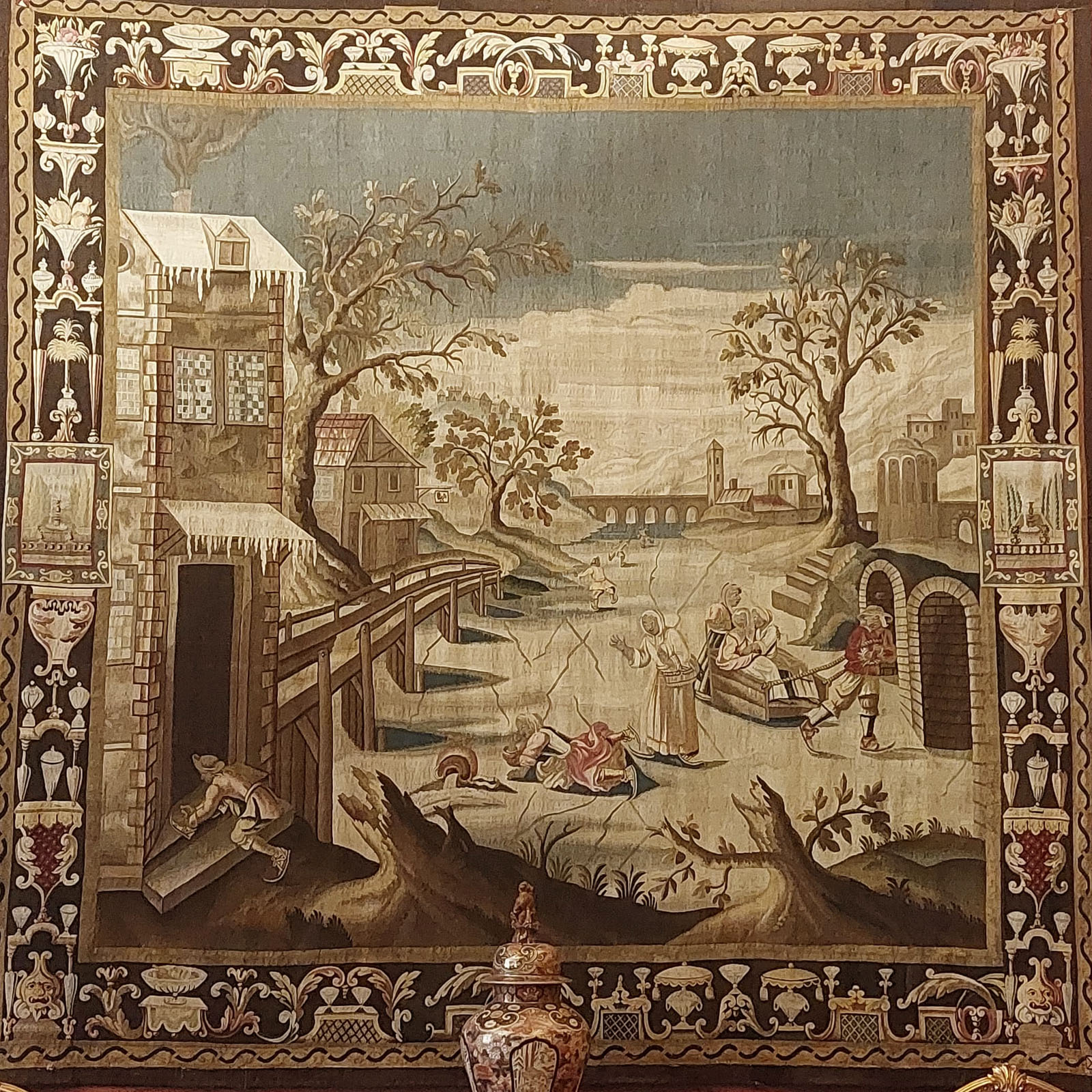 Auf einem barocken Wandteppich im Alten Hauptbau von Residenzschloss Ludwigsburg sind Menschen auf Schlittschuhen zu sehen. Die Szene hat jedoch wenig mit einem olympischen Wettkampf gemein – sie zeigt vielmehr ein bäuerliches Vergnügen. Im Vordergrund des winterlichen Wimmelbilds ist eine Frau zu sehen, die auf dem Eis ausgerutscht ist und ihren Krug fallen gelassen hat. Im Hintergrund präsentieren geschicktere Eisläuferinnen und Eisläufer ihre Künste. Der Ursprung des Tapisserie-Motivs liegt in der niederländischen Kunst des 17. und 18. Jahrhunderts, deren winterliche Alltagsszenen vielfach als Vorlagen für Tapisserien dienten. Denn in den wasserreichen Regionen des Landes mit all ihren Kanälen gehörte das Eislaufen zu den typischen Wintervergnügungen und wurde so auch zu einem beliebten, erzählerischen Bildthema.