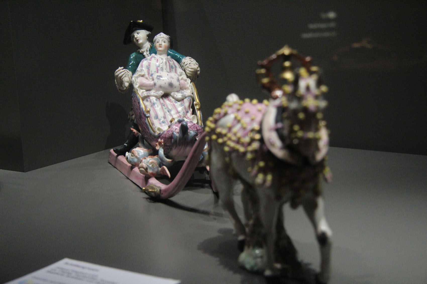Die Schlittengruppe gehörte einst zur Ausstattung des kurfürstlichen Hofes und ist bereits im Inventar von Schloss Mannheim aus dem Jahr 1763 erwähnt. Aufbewahrt wurde sie in der Hofkonditorei: Solche Stücke dienten als kunstvoller Tafelschmuck des Dessertgangs, der die festlichen Bankette in überraschenden Kompositionen inszenierte. Vermutlich geht der Entwurf auf den führenden Frankenthaler Modellmeister Johann Friedrich Lück zurück. Fein gearbeitet bis ins Detail – vom Dreispitz und dem pelzgefütterten Samtmantel des Kavaliers bis zum Hermelinmuff der Dame – gehört die Miniaturplastik aus der kurfürstlichen Porzellanmanufaktur Frankenthal zu den herausragenden plastischen Arbeiten ihrer Zeit und ist heute in Schloss Mannheim zu bewundern.