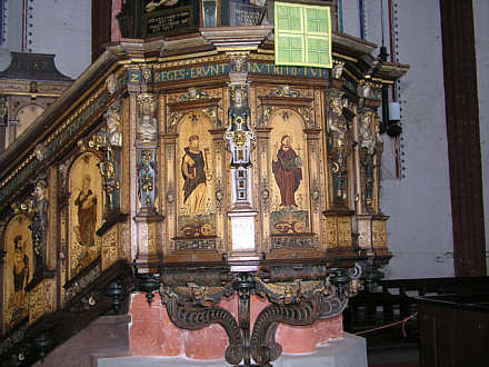 Kanzelkorb: Christus im Mittelfeld, links daneben Petrus (mit dem Schlüssel), jeweils in von Hermen getrennten Rundbogenfeldern.