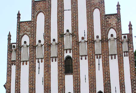 Adorantinnen am stadtseitigen Turm: unter dem Giebel 9 weibliche Steinfiguren in steifen Plisseegewändern, sog. Adorantinnen, die die Hände grüßend oder segnend der Stadt entgegenstrecken.