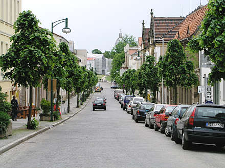 Schlossstraße als eine der acht vom zentralen Stadtplatz ausgehenden Achsen. Im Hintergrund die Atrappe des Schlosses und der stählerne Schlossturm.