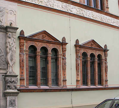 Drillingsfenster, jeweils in einer Giebelarchitektur mit Hermenpilastern zusammengefasst.