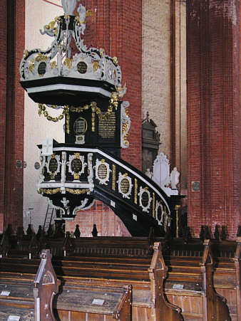 Kanzel, 1708, Aufgang und Kanzelkorb mit Inschriftkartuschen, der kronenförmige Schalldeckel mit reichem Akanthusornament. Über dem Portal zum Aufgang das Bildnis der Stufter zwischen Allegorien von Glaube und Hoffnung.
