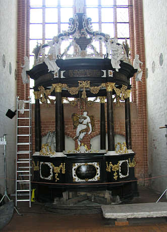 Taufgehäuse, J. v. Rehn, 1709 Kronenartige Bedachung von sechs Säulen getragen, in der Mitte ein hängender Engel.