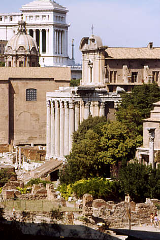 Seitenansicht mit Pronaos und Freitreppe, im Hintergrund die Curia und der Altare della Patria