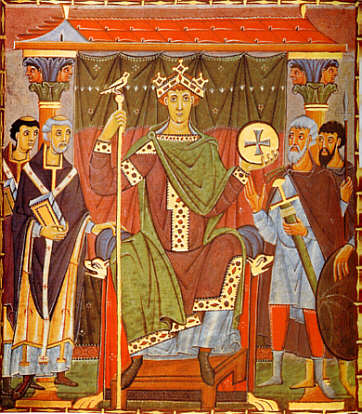 Der Kaiser - Otto III. - sitzt in spätantiker Tradition auf einem Thron