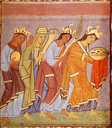 Vier barfüßige Frauengestalten nähern sich in demütiger Haltung dem kaiserlichen Thron und reichen dem Herrscher ihre Geschenke dar: die Schale der Reichtümer, den Lorbeer des Ruhmes, das Füllhorn des Glücks und die Sphaira der Herrschaft. Die Gestalten sind durch die Benennung als (von rechts nach links) Roma, Gallia, Germania und Sclavinia, also als die Personifikationen des italienischen, romanischen, deutschen und slawischen Reichsteils bezeichnet. |