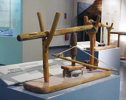 Der Bohrer besteht aus einem gehärteten Stück hohlem Holunderholz und wird mit einem Bogen im schnelle Bewegung versetzt.