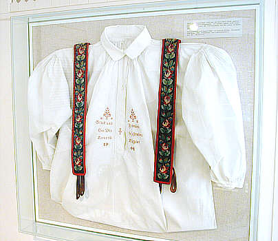 Flachsverarbeitung Leinenhemd mit handbestickten Hosenträgern (unter der Jacke getragen). Auf der Hemdbrust der Segenswunsch "Glück und Frieden/ sei Dir beschieden/ Konrad Bühler/ 1904" |