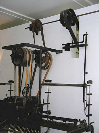 Transmissionsanlage in der Installation "Baumwollspinnerei" Parallele und rechtwinklig abgelenkte Übetragung der Drehbewegung, ermöglicht durch die Flexibilität der Lederriemen.