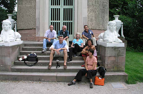 Die Fortbildungsgruppe "Handlungsorientierter Lerngang und Multimedia im Schwetzinger Schlossgarten" auf den Stufen des Tempels der Waldbotanik - 15.6.04