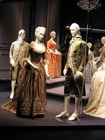 Robe à l´anglaise, das Kleid nach englischer Art, ein Kleid im einfacheren Stil des ausgehenden 18. Jahrhunderts, nur noch mit einem kleinen Gesäßpolster getragen. Braun gestreifte Seide mit Seidenapplikationen.
