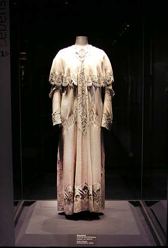 Dennoch ist das Kleid durch den schweren, mit Perlen bestickten