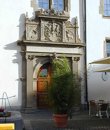 Von kannelierten Pilastern mit ionischen Kapitellen flankiertes Rundbogenportal, darüber der württembergische Wappenschild mit zwei Hirschen zur Seite, abgeschlossen durch zwei Obelisken und zwei Kugeln.