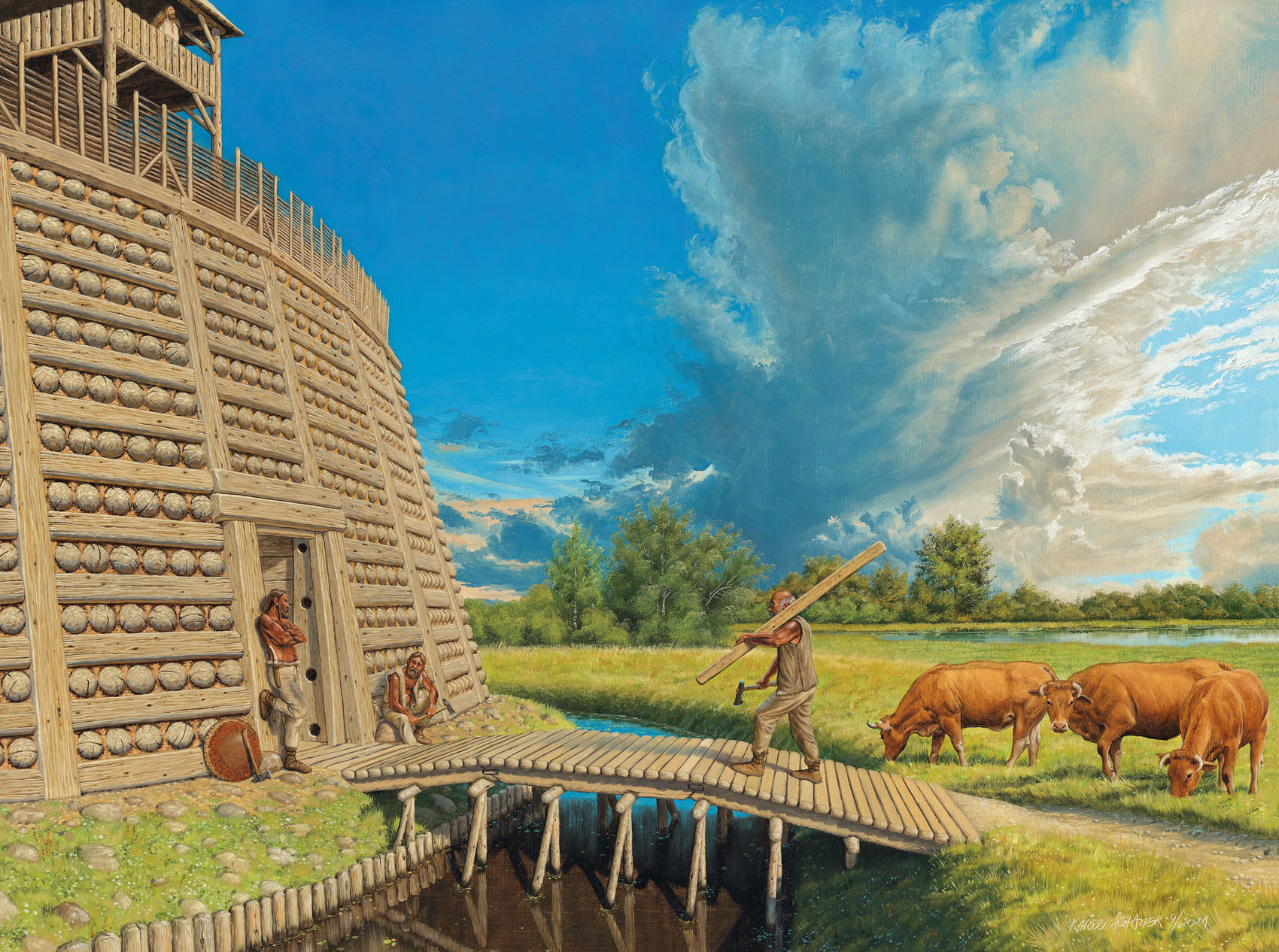 Rekonstruktion einer slawischen Rundburg des 9.-10. Jahrhunderts. Die offenen Dörfer der Einwanderergeneration wurden östlich der Elbe aufgrund des fränkisch-sächsischen Eroberungsdrucks ab dem 8. Jahrhundert zugunsten befestigter Anlagen aufgegeben.